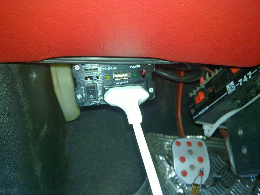 Od teraz, gdy będę mieć mało do lutowania to nie muszę nigdzie jeździć. Zainstalowałem przetwornicę na stałe, a do tego mam dodatkową ładowarkę USB w samochodzie (to już czwarta...) Nie potrzebuje dużej mocy, wybrałem przetwornicę o mocy ciągłej 150W i szczytowej 300W (lutownica ma moc 75W).